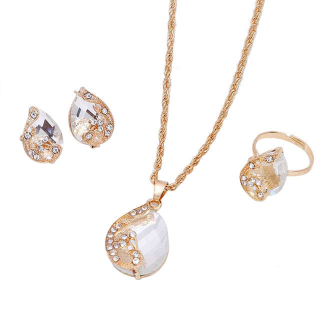Women Jewelry Set Shiny Water-Drop Shape Rhinestone Necklace Earrings Ring Gift Peacock Crystal Korean Jewelry Set