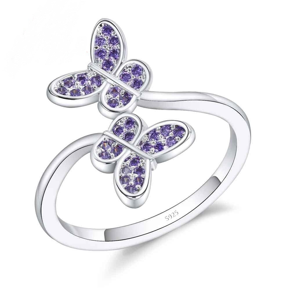 High Quality Noble Purple Crystal Ring for Wedding Engagement Double Butterfly Open Rings Adjustable 925 Sterling Silver Jewelry