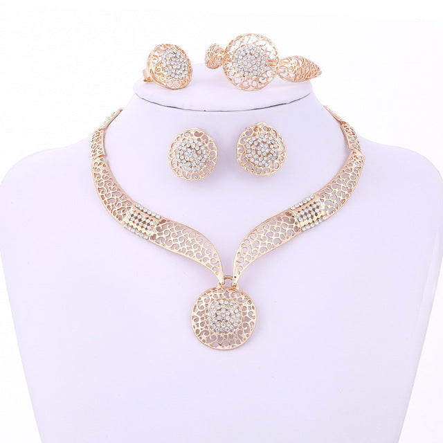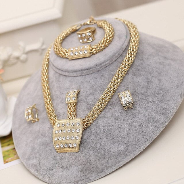 Vintage Gold Jewelry Sets Necklace Earrings Bracelet Ring For Women Crystal African Wedding Bridal Party Accessories Gift